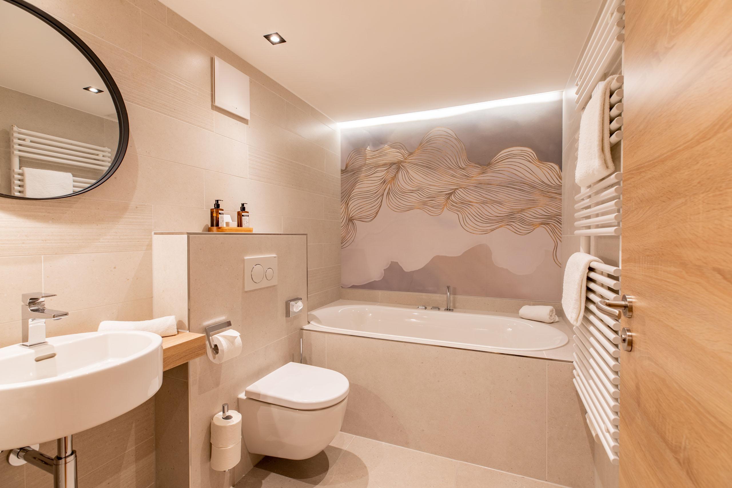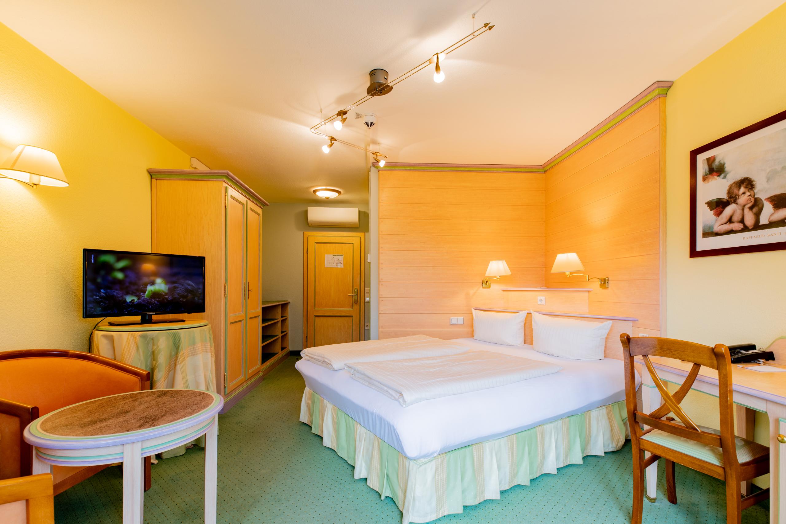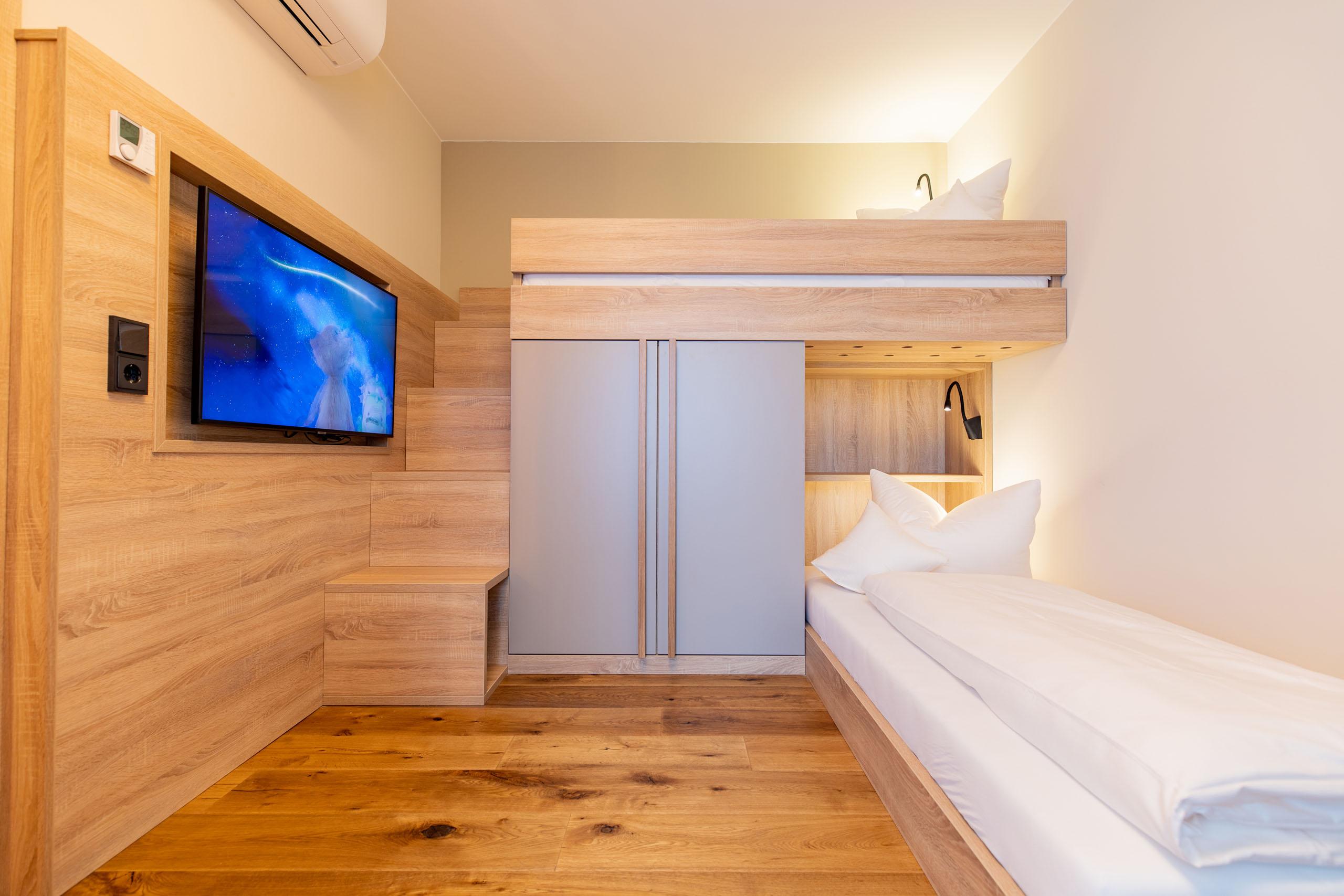 The suite with three bedrooms for large families! A connecting door joins the Family Spa Suite Römerfels and the Double Room Napoleonsfels, creating a spacious suite for up to seven people. The 97m² Family Spa Suite Römerfels on the 3rd floor features a bathroom with shower, double washbasin, and separate WC, as well as a sauna and infrared cabin, a second bathroom with bathtub and WC, whirlpool on the balcony, safe, telephone, Wi-Fi, three Smart TVs, minibar (contents included), kettle for making tea and coffee, climate-controlled wine cabinet (contents included), fireplace, air conditioning, and separate living room. The Family Spa Suite also has a children’s room with bunk beds.The 24m² Double Room Napoleonsfels has a small, simple bathroom area with shower, WC, and hairdryer. The room features an additional small balcony, telephone, Wi-Fi, Suitepad, cable TV, radio alarm clock, minibar (included for you), and safe.