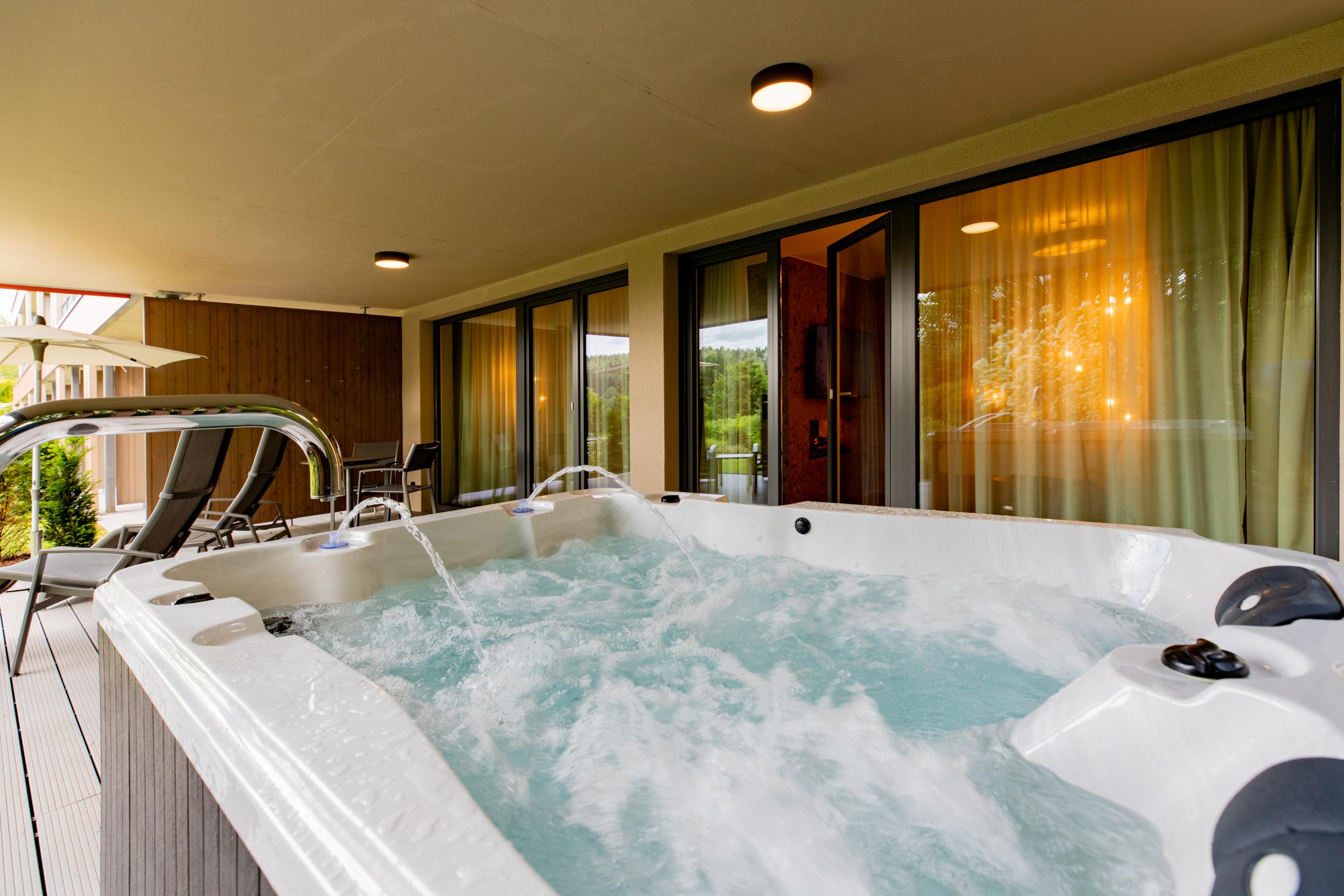 The exclusive suites in the garden wing for private spa indulgence! The spacious, luxurious Römerfels Spa Suites on the 1st, 2nd, or 3rd floors provide an exceptional amount of space for your personal retreat. You’ll feel right at home as soon as you step inside. An entrance area, furnished with plenty of wood and warm colours, provides access to the guest WC and leads into the living area with a TV. Floor-to-ceiling windows and the view of the electric fireplace create a cosy and welcoming atmosphere. The bedroom, with a high-quality double bed, a second TV, Suitepad, and a lounge chair, invites you to relax. A glass door leads into a modern wellness oasis, with the bathtub offering a panoramic view of nature. The bathroom is also equipped with a double washbasin, shower, and another, separate toilet, as well as an internet radio. This is also where you’ll find the infrared/sauna cabin for private spa moments. All suites have a large balcony or terrace, complete with a whirlpool and relaxation loungers. A well-stocked wine climate cabinet (contents included) is available in the suite. Naturally, the spa suites also include a safe, telephone, hairdryer, Wi-Fi, minibar (contents included), kettle for making tea and coffee, and air conditioning. A bathing bag with sauna towels and terry-cloth slippers as well as a bathrobe per person is, of course, also provided.