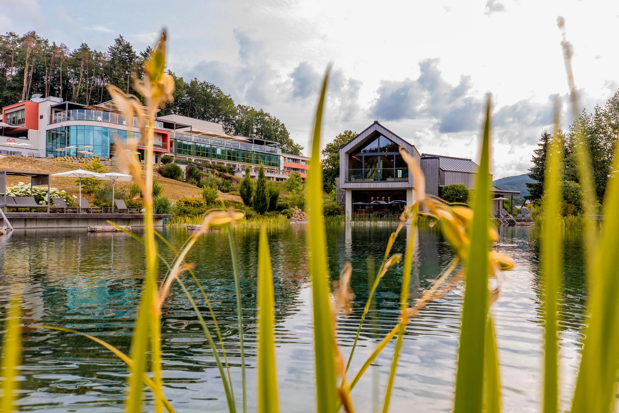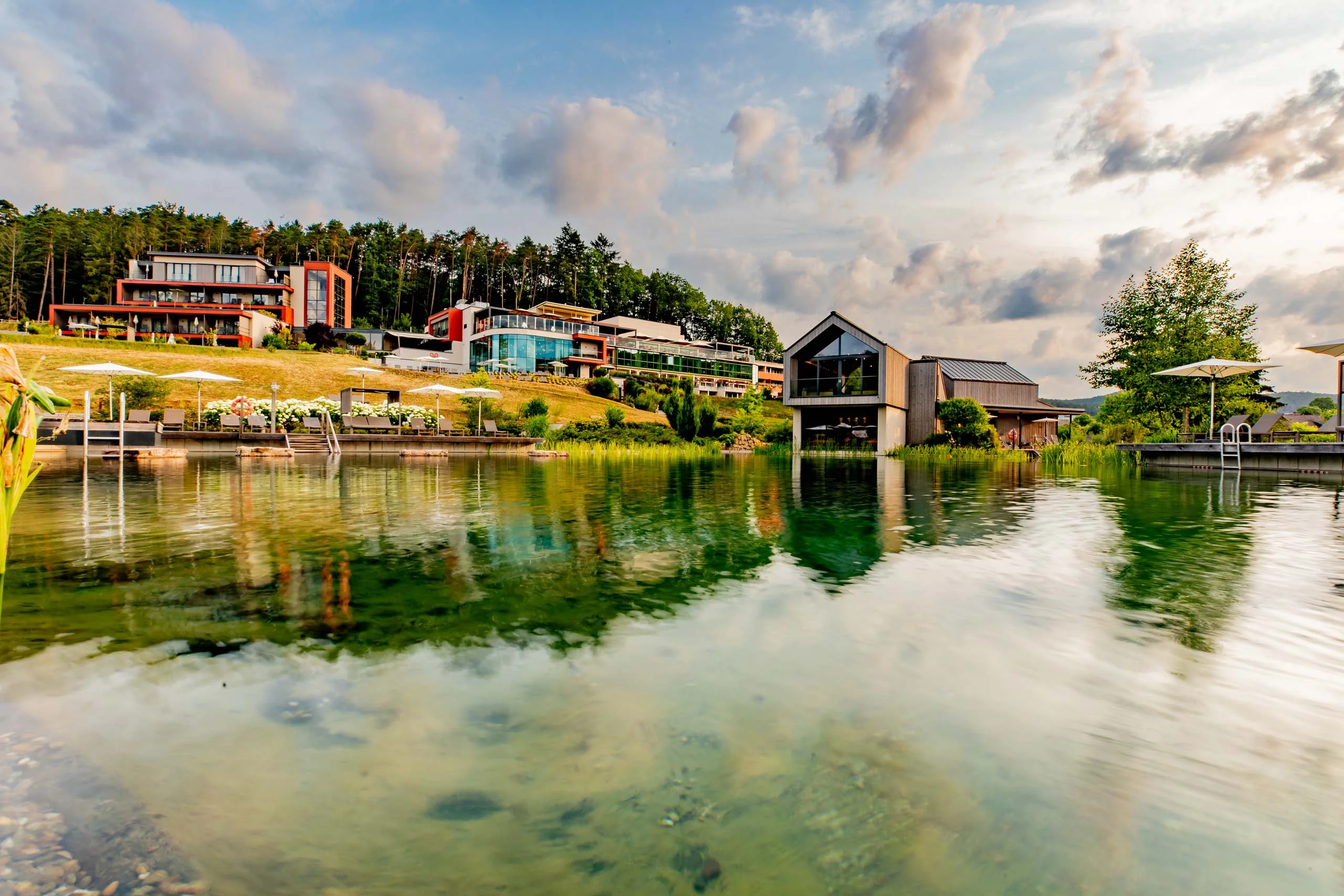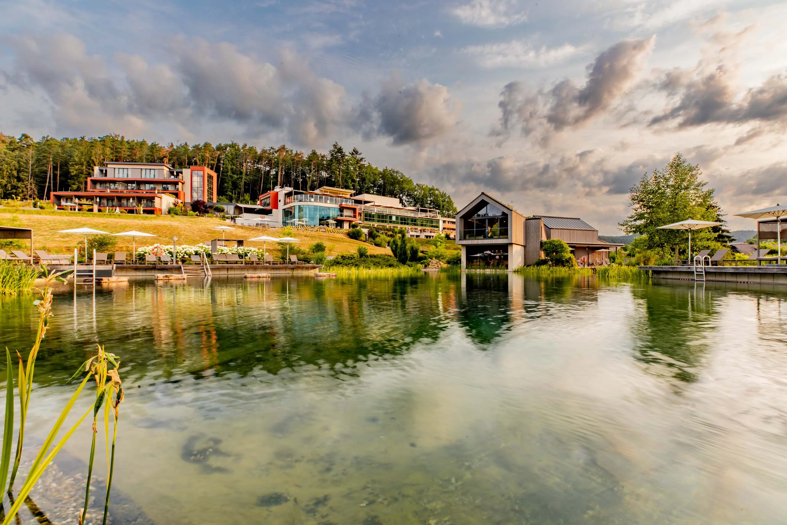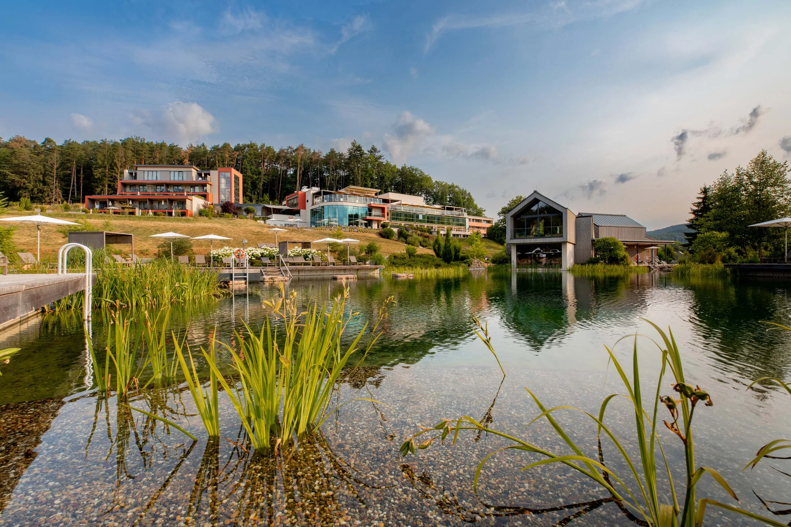 38 Meter Schwimmlänge und eine Gesamt-Wasseroberfläche von 1.500 m² bietet der 2019 fertiggestellte Naturschwimmteich in unserem Pfalzblick Wald Spa Resort im Dahner Felsenland. Naturschwimmteich, weil dieser sich durch seine Tiefe selbst reguliert und deshalb ganz ohne Chemie auskommt. Das natürliche, biologische Gleichgewicht sorgt dabei für glasklares Wasser im "kleinen Wasgausee". Vier Filterpumpen wälzen das Wasser in der warmen Jahreszeit zusätzlich um und sorgen dabei für ständige Sauerstoffzufuhr.