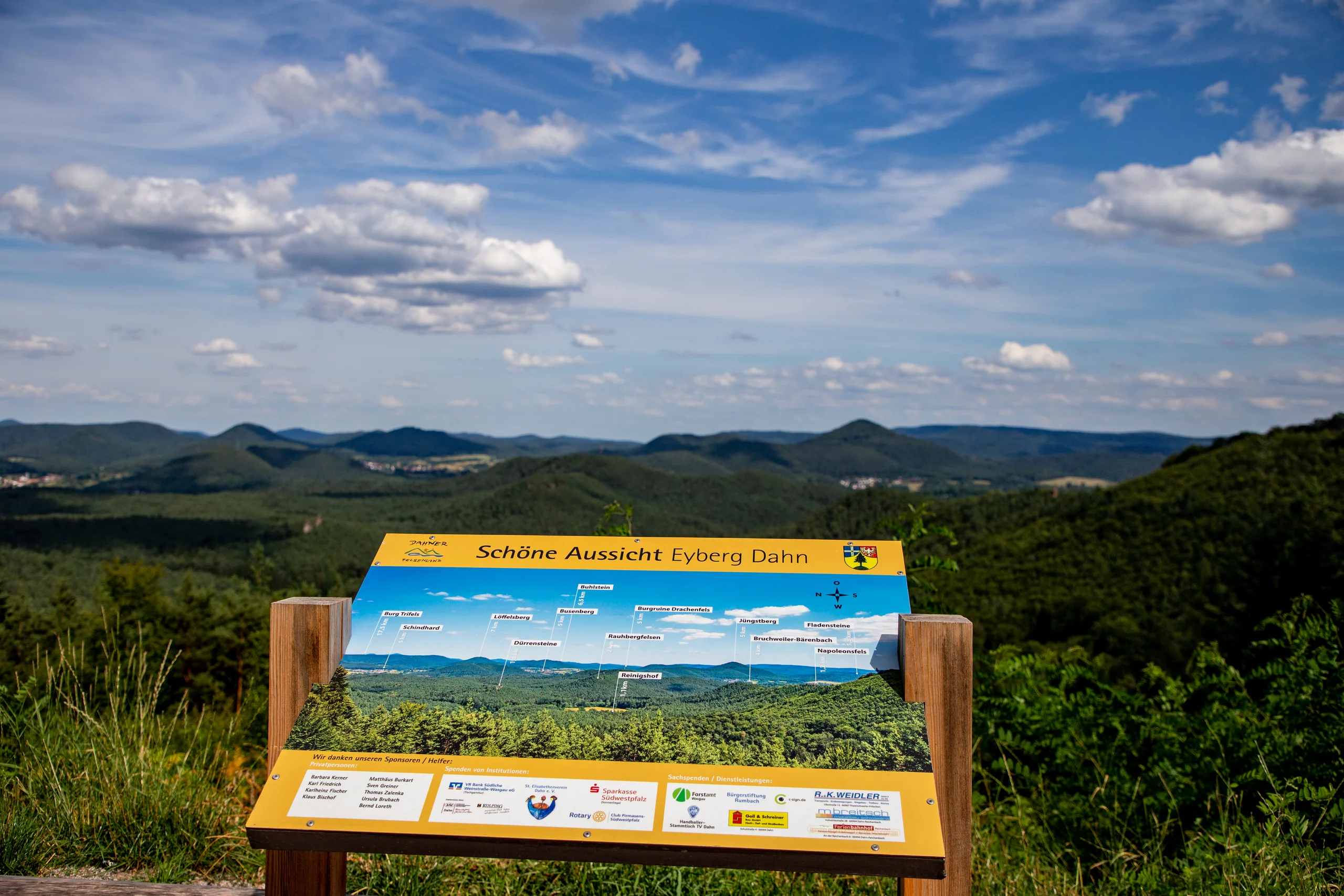 Auch für Gäste des Pfalzblick mit eingeschränkter Mobilität hält das Dahner Felsenland ein echtes Natur-Highlight bereit: den barrierefrei gestalteten Wasgaublick, erreichbar mit dem Auto. Vom Hotel aus führt der Weg über Hasenberg, vorbei an Braut- und Bräutigam und dem Felsland Badeparadies, hoch zum Parkplatz am Großen Eyberg. Dort beginnt der kurze, gut ausgebaute Weg zur Aussichtsplattform – ideal für Rollstuhl- und Rollatornutzer. Ein weiterer schöner Aussichtspunkt ist der Burgenblick hinter der Burg Altdahn