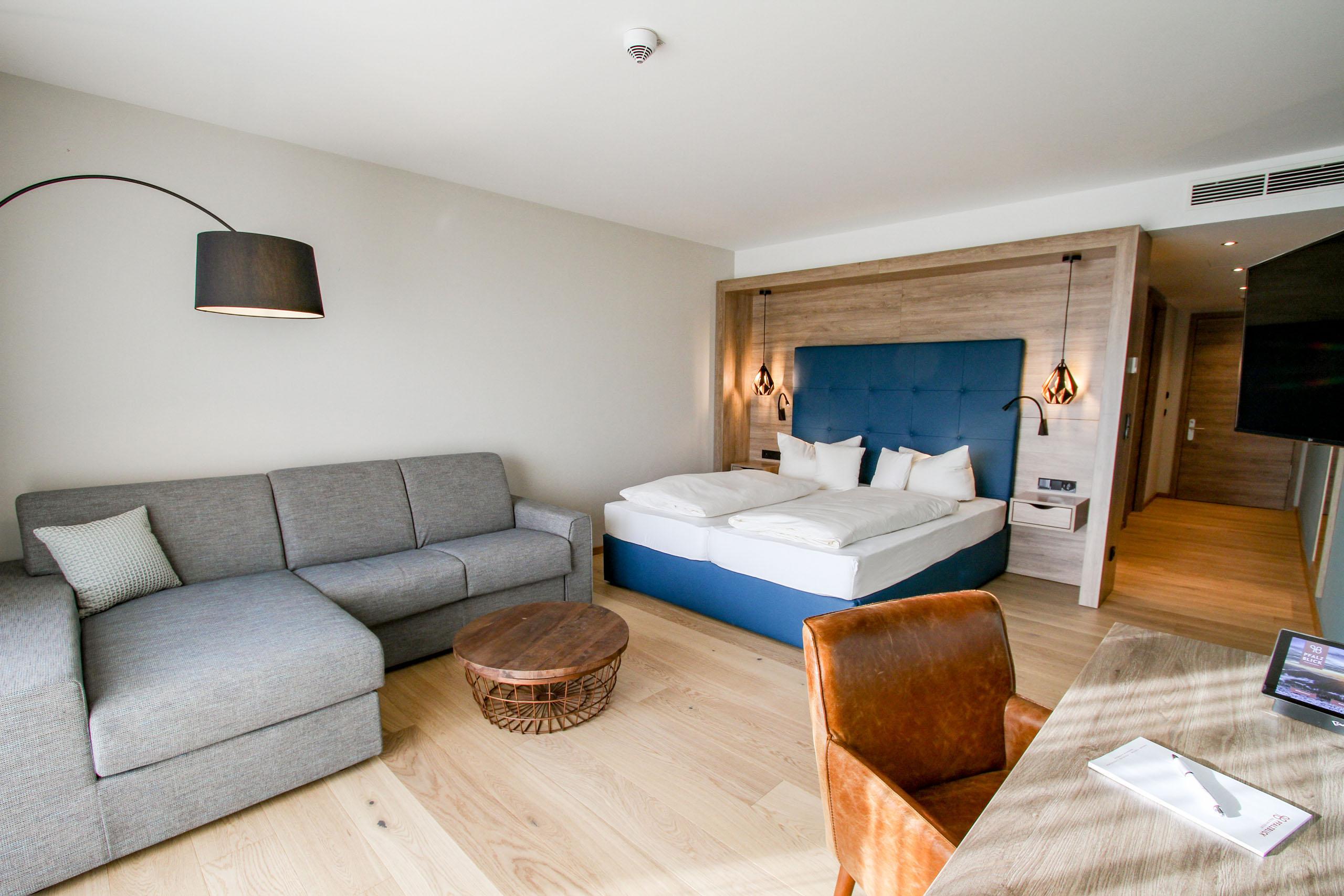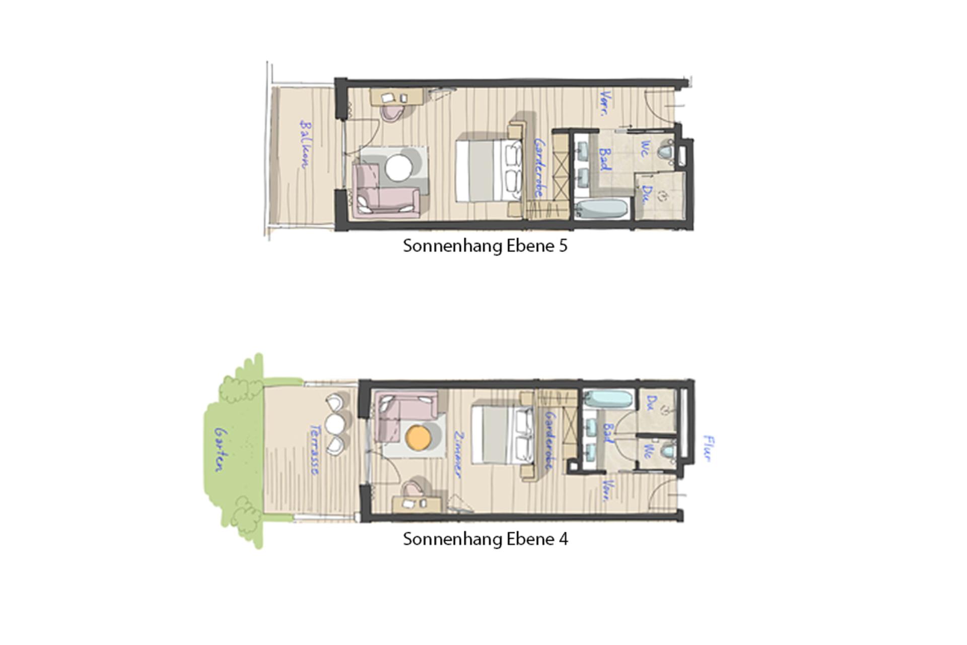 Die Doppelzimmer im Sonnenhang mit Blick Richtung Südwesten ins Wieslautertal und zu den umliegenden Felsen sind ausgestattet mit großem Bad mit Badewanne, Dusche, WC (auf Ebene 4 separat), Terrasse (auf Ebene 4) bzw. Balkon (auf Ebene 5), begehbarem Kleiderschrank, Safe, Telefon, WLAN, Suitepad, Kabel-TV, Minibar (Befüllung inklusive), Wasserkocher für Tee- und Kaffeezubereitung, Klimaanlage und abgetrennter Sitzecke. Ein Zimmer auf Ebene 5 ist behindertengerecht ausgestattet, vier Zimmer auf Ebene 5 sind barrierefrei.