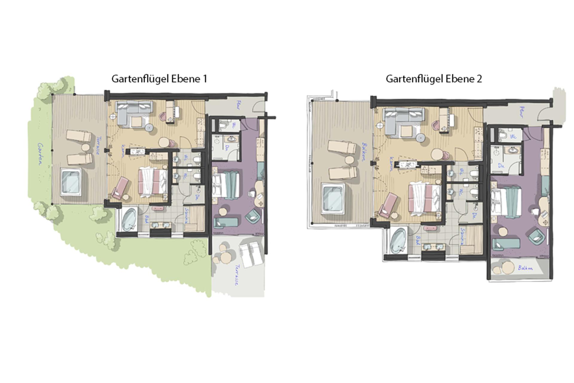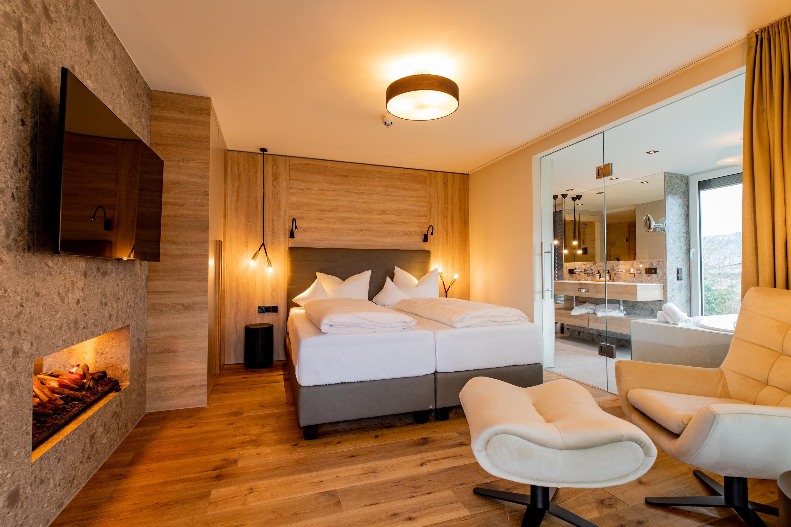 Die besonders großzügige Spa Suite mit zwei Schlafräumen: Durch eine Tür werden Spa-Suite Römerfels und Doppelzimmer Tanstein auf Ebene 1 oder 2 miteinander verbunden. So bietet die Magnum-Spa-Suite Römerfels viel Platz für eine entspannte Auszeit. In den Magnum-Spa-Suiten stehen Ihnen neben zwei Schlafräumen mit jeweils eigenen Badezimmern, einem Wohnbereich und einem Gäste-WC auch eine eigene Infrarot-/Saunakabine und ein Whirlpool inklusive Relaxliegen auf dem Balkon/der Terrasse zur Verfügung. Ein gut gefüllter Wein-Klimaschrank steht Ihnen in der Suite ebenfalls zur Verfügung (Befüllung inklusive). Selbstverständlich finden Sie in den Spa-Suiten auch Safe, Telefon, Föhn, WLAN, Minibar (Befüllung inklusive), Wasserkocher inklusive Tee- und Kaffee-Zubereitungsmöglichkeit und Klimaanlage.