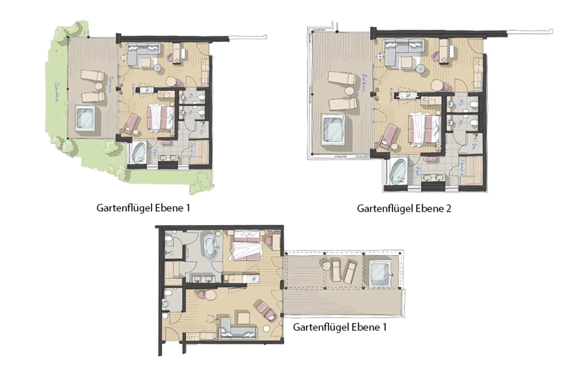 Die exklusiven Suiten im Gartenflügel mit Private-Spa-Vergnügen! Die großen, luxuriösen Spa-Suiten Römerfels auf den Ebenen 1, 2 oder 3 bieten außerordentlich viel Platz für Ihre persönliche Pausenzeit. Das Gefühl von Nachhausekommen erleben Sie schon beim Eintreten. Ein mit viel Holz und warmen Farben ausgestatteter Vorraum mit Zugang zum Gäste-WC und Übergang zum Wohnbereich mit TV sorgen in Kombination mit bodentiefen Fenstern und dem Blick auf den E-Kamin für eine wohlig warme Atmosphäre. Das Schlafzimmer mit hochwertigem Doppelbett, einem zweiten TV, Suitepad und Lounge-Sessel lädt zum Verweilen ein. Durch eine Glastür geht es hier in eine moderne Wohlfühloase. Die Badewanne bietet einen Rundum-Panoramablick in die Natur. Das Badezimmer ist außerdem mit einem Doppelwaschbecken, Dusche und einer weiteren, räumlich abgetrennten Toilette ausgestattet und verfügt über ein Internetradio. Hier befindet sich auch die Infrarot-/Saunakabine für private Spa-Momente. Alle Suiten sind mit einem großen Balkon bzw. Terrasse ausgestattet, auf der sich ein Whirlpool und die Relaxliegen befinden. Ein gut gefüllter Wein-Klimaschrank steht Ihnen in der Suite zur Verfügung (Befüllung inklusive). Selbstverständlich finden Sie in den Spa-Suiten auch Safe, Telefon, Föhn, WLAN, Minibar (Befüllung inklusive), Wasserkocher inklusive Tee- und Kaffee-Zubereitungsmöglichkeit und Klimaanlage.